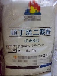 又名马来酸酐或失水苹果酸酐,常简称顺酐。无色结晶,有强烈刺激气味,凝固点52.8℃,沸点202℃,易升华。主要由苯或碳四馏分中的正丁烷或丁烯氧化而制得,是生产不饱和聚酯及有机合成的原料。