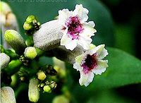 ,两面无毛或近无毛,有时下面脉腋内有束毛;侧脉每边4-6条,纤细;叶柄长1.5-7厘米;托叶长3-5毫米,无毛。圆锥花序式的聚伞花序腋生和顶生,扩展,分枝对生,末次分枝上着生的花常呈蝎尾状排列;小苞片披针形,长约2毫米;花具短梗或无;萼管陀螺形,长1-1.2毫米,萼檐裂片5,裂片三角形,长0.8-1毫米;花冠浅紫色,管长7-10毫米,外面被粉末状柔毛,里面被绒毛,顶部5裂,裂片长1-2毫米,顶端急尖而直,花药背着,花丝长短不齐。果球形,成熟时近黄色,有光泽,平滑,直径5-7毫米,顶冠以宿存的萼檐裂片和花盘;小坚果无翅,浅黑色。花期5-7月。