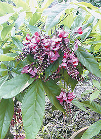 生活习性木质藤本,除花序和幼嫩部分有黄褐色柔毛外,其余无毛。羽状复叶;小叶7—9,卵状长椭圆形或卵状披针形,长4-12厘米,宽1.5-5.5厘米,两面均无毛,网脉明显。圆锥花序顶生,下垂,序轴有黄色疏柔毛,花多而密集,单生于序轴的节上;萼钟形,裂齿短而钝;花冠紫色或玫瑰红色,无毛。荚果扁,线形,长达15厘米,宽约2厘米,果瓣近木质,种子间缢缩;种子扁圆形。花果期7—10月。