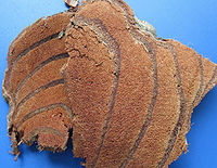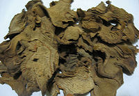 性状:该品为椭圆形、长矩圆形或不规则的斜切片,厚0.3~1cm。栓皮灰棕色,有的可见灰白色斑,栓皮脱落处现红棕色。切面木部红棕色或棕色,导管孔多数;韧皮部有树脂状分泌物呈红棕色至黑棕色,与木部相间排列呈3~8个偏心性半圆形环;骨部偏向一侧。质坚硬。气微,味涩。