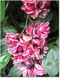 在云南西双版纳热带雨林中,有一类桑科榕属(Ficus)植物,它们常寄生于参天大树的树干上,拼命地夺走寄主的养料和水分,使其枝繁叶茂。这类寄植物盘根错节地将寄主的树干、树枝包围起来,把大树勒得喘不过气来,最终死于非命。这就是大家都熟知的绞杀植物或称毁坏植物。这对于你或许不是新闻。但是在西双版纳密林中或石灰山沟谷季雨林的悬崖上,还长着一种会流血的植物-鸡血藤。这你也许很少听说过。在植物界中,正是这些姿态万千、稀奇古怪充满神奇色彩的植物深深地吸引着人们,使人类不断去探索植物界奥秘。鸡血藤(Millettia)属蝶形花科(Papilionaceae)鸡血藤属植物,集观赏及药用为一身。云南产24种,占中国鸡血藤植物总数的一半以上。滇南、滇南、滇西南及滇西北热带、亚热带地区资源最为丰富。