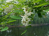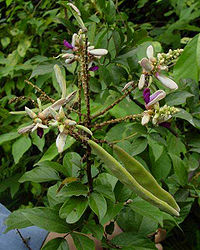 攀援灌木。形态与上种相似,幼枝有平贴丝状细毛,后变光滑。小叶披针形或卵形,长5~8厘米,两面光亮。圆锥花序顶生,长6~10厘米;花长约2厘米;萼钟状,密生绢毛;花冠紫色,旗瓣外面白色,有绢毛,基部有2个胼胝体状附属物。荚果条状矩圆形,长10~14厘米,有绒毛;种子4~5粒.