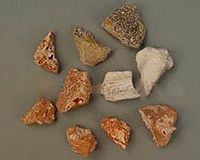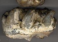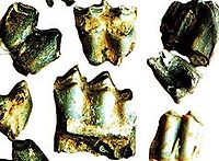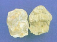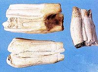 龙齿 呈齿状或破碎成不规则的块状。完整者可分为犬齿及臼齿。犬齿呈圆锥形,先端较细或稍弯曲;长约