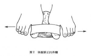 早期病变,疼痛较轻者,可采用非手术疗法,包括穿着前部宽大的跟高不超过2.5cm的鞋、按摩、搬动𧿹趾向足内侧,在沙土上赤足行走,锻炼足肌,热敷,休息等。体操矫正𧿹外翻也有一定疗效,即在两侧第1趾上套橡皮带做左右相反方向牵引动作,2次/d,每次5~10min(图2)。