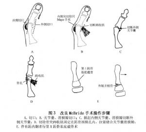 手术方法已报道的有200多种,可归纳为5类:①软组织手术:主要将𧿹收肌在近节趾骨的止点切断,移位于第1跖骨头的腓侧,以McBride手术为代表;②骨切除术:切除部分骨骼,使挛缩的软组织松弛,解除症状常用的有Mayo手术和Keller手术;③矫正第1跖骨内翻截骨术,或同时施行软组织手术和(或)骨切除术;④第1跖趾关节融合术;⑤小切口手术。