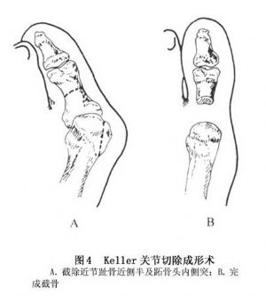 外翻患者,是治疗𧿹外翻最常用的术式之一。Keller手术包括软组织松解,内侧突切除及近节趾骨截除术3部分,此手术可矫正畸形与解除𧿹趾疼痛,但术后数月至1年内 趾粗而软弱无力,以后𧿹跖趾关节活动范围亦较小,术前应向病人解释清楚。