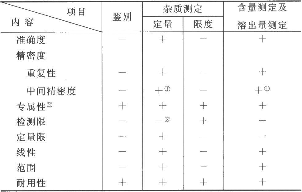 验证内容有:准确度、精密度(包括重复性、中间精密度和重现性)、专属性、检测限、定量限、线性、范围和耐用性。视具体方法拟订验证的内容。附表中列出的分析项目和相应的验证内容可供参考。