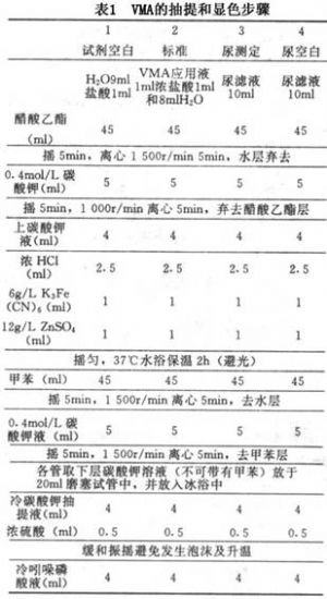 取加浓HCl 10ml防腐的24h混合尿30ml,放入50ml磨塞尖底离心管内,加浓HCl 3ml,活性硅酸镁3g,摇10min。过滤或离心,收集滤液(上清液)待用。以下按表1抽提和显色。