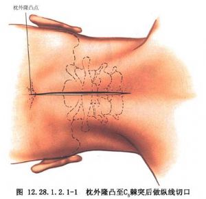 枕外隆凸至C5棘突后纵线做切口(图12.28.1.2.1-1)。