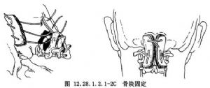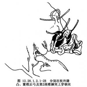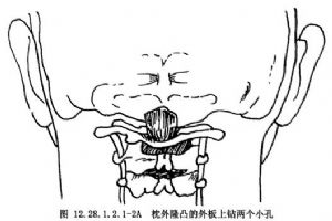 取自体髂骨块约等于枕外隆凸至C3棘突的长度,其宽度约等于颈椎椎板宽度的大小,再取下一部分细条状骨片后关闭髂骨切口。将切下的髂骨块修成两半,在每半骨块各钻3个小孔。然后通过牙钻在枕骨大孔上方2cm的枕外隆凸的外板上钻2个小孔,深度达颅骨外板,并使两孔相通,便于钢丝通过(图12.28.1.2.1-2A)。然后在第2颈椎棘突上形成一个孔。分别在枕外隆凸、寰椎后弓及第2颈椎棘突上各穿一根20号的钢丝,以环状穿过(图12.28.1.2.1-2B),将骨块的凸面朝下,凹面朝上,通过钢丝把骨块的上孔固定在枕骨上,下两个骨孔分别与寰椎及第2颈椎棘突进行固定(图12.28.1.2.1-2C)。再把细条骨片填在骨块两侧。