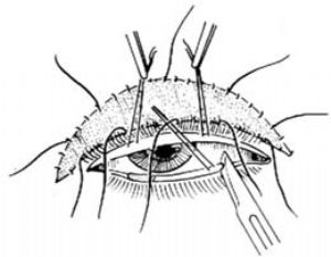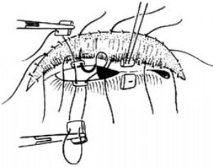 4.缝合睑缘:在上、下睑缘的中、内1/3交界处和中、外1/3交界处的睑缘上,分别切除4×2mm的长度形组织,形成上、下相对的创面,作睑缘间缝合,造成眼睑粘连[图1 ⑷ ⑸]。