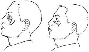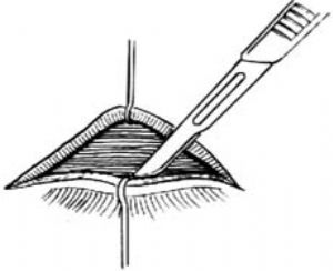 1.切口 在距睑缘2~3mm处作与睑缘平行的切口,切口的两端略超过内、外眦部[图1 ⑴]。