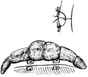 3.移植皮片 自上臂内侧或锁骨上窝取全厚或中厚皮片移植于创面上,缝合皮片[图1 ⑶]。
