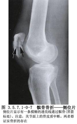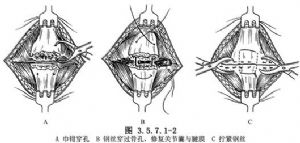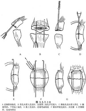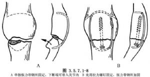 ④髌骨粉碎骨折,若近及远侧骨块锯平能使互相适应,可用2枚拉力螺钉固定,再加用张力带纲丝穿过肌腱附着处,可以保护螺钉(图3.5.7.1-7)。
