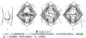 (2)显露:切开皮肤、皮下组织及筋膜,显露骨折及股四头肌断裂处。屈膝,清除关节内积血和碎骨片,并冲洗。