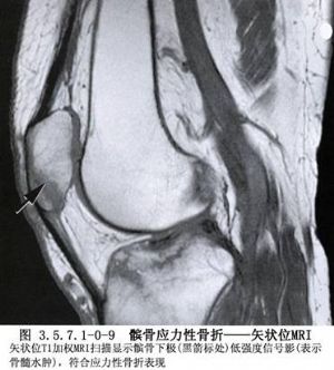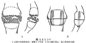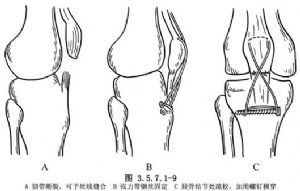 若采用张力带纲丝,则与髌下韧带断裂的方法相同,钢丝经股四头肌附着点与胫骨结节做“8”字缝合。此法使骨折愈合转为韧带愈合。