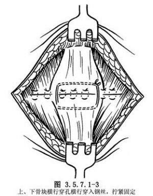 2.钢丝内固定法 有钢丝纵穿及横环固定两种方法,适应于横或斜骨折,骨片不多、变位小的粉碎骨折,陈旧性移位不大者也可用。