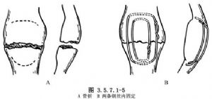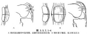 以髌骨为例,若将张力带钢丝放在髌骨中段周围,当屈膝时,折块前部即分离。若钢丝置于髌前,穿过股四头肌腱和髌韧带,所有张力都被抵消,骨骼处于单纯压应力之下,可允许早期活动锻炼,且不需外固定(图3.5.7.1-4)。