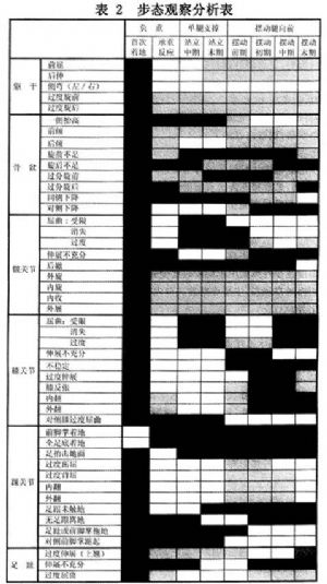 表2由美国加利福尼亚RLA医学中心设计提出,它为临床治疗人员提供了系统观察步态的手段。该评价表中包含了48种常见的异常表现,如足趾拖地、踝关节过度跖屈或屈曲、踝或膝关节内、外翻、髋关节抬高、躯干侧弯等。遵循评价表所提示的内容,评定者能够系统地对每一个关节或部位,即踝、膝、髋、骨盆及躯干等在步行周期的各个分期中的表现进行逐一分析。该表行排为步行周期分期;纵列按躯干、骨盆、髋、膝、踝及足趾的顺序将48种异常表现依次列出。表中涂黑的格子表示与该步行分期相对应的关节运动情况可以省略而无需观察;空白格和浅灰色格子则表示要对这一时间里是否存在某种异常运动进行观察和记录。在有异常存在的格中打“√”。如为双侧运动则用“左”或者“右”表示。空白格表示最需要重点观察的情况。