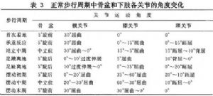 ⑤正常步行周期中骨盆及下肢各关节运动时的角度变化(见表3)。