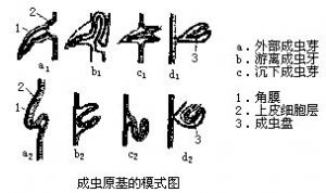 成虫原基也称器官芽。是指昆虫幼虫体内成虫器官原基而言。足原基和翅原基虽都是上皮细胞层一部分增厚而成,但其形态可因昆虫变态方式的不同而异。不完全变态的昆虫,其足、翅都存在于幼虫(或若虫)的足、翅内部(即幼虫的上皮细胞层本身就是成虫原基),此称为外部成虫原基与幼虫的足、翅〔把成虫原基作为主体来看时,则称为足鞘(leg sheath),翅鞘(wing sheath)〕同时生长,在蜕化脱皮过程中完成其发育。完全变态的昆虫和不完全变态昆虫中的高等种类,其成虫器官原基是从幼虫表皮内陷,转变成为内部成虫原基,而初期的形态,如长翅目等种类,是为游离成虫原基(德freie Imaginala-nlage)。其再向内部陷入的形态就是沉埋成虫原基(少足型幼虫和多足型幼虫的胸足的成虫器官原基。完全变态类的翅及其高等种类(双翅目等)的足和触角等的成虫原基,是与它们幼虫体上没有足和翅相适应,下陷程度更加明显,而成为反转成虫原基(德reverse Imaginalanlage)和有柄成虫原基(德gestielte Imaginalanlage)更深地沉埋于体内,形成与幼虫体表无关的状态而继续发育下去,这两种类型的原基特称为成虫原基(imaginal disk)或器官芽。完全变态类昆虫的成虫原基在蛹化脱皮时,迅速发育,而反转成虫原基和有柄成虫原基也由于体液的压力而被挤向身体表面而形成了蛹。已经证明双翅目等在胚胎发育初期成虫原基的分化便已完成,其以后的幼虫器官和成虫原基几乎是单独发育起来的。成虫原基的生长曲线在完全变态类显示与幼虫期脱皮无关的上升变化。伴随变态中蜕皮激素的作用迅速开始分化,而且强烈地决定着分化方向。但是如果强制地使盘上的细胞反复进行分裂(例如将果蝇的成虫原基移至活成虫体内培养时),便会引起异常的形成。有这样的实验例子,把复眼原基移植至18代的成虫则产生了平衡棍原基(haltere blastema),这是由于分化的决定发生了变化的缘故。
