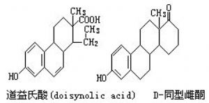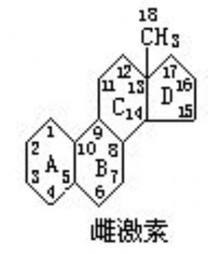 不论来源如何,凡具有动情素作用的物质均称为雌激素。动情素当然更不用说,其代谢产物的一部分(例如马烯雌酮、马萘雌酮等)及其取代物(例如乙基雌二醇等)的雌烷系的C18类固醇,最初均系来自动物,不过其中也有的存在于椰子的果实和沥青等与动物毫无关系的一些地方。另外,作为雌激素的物质还有完全可以通过合成而取得的不含类固醇结构的物质,诸如1,2-二苯乙烯衍生物的乙烯雌酚和己雌酚(hexestrol)、苯雌酚(benzestrol),以及氧化雌酮类的D环而被开环的道益氏酸(doisyno-lic acid)系物质,或雌烷的D环变为六环的同型雌酮等。有关这些结构不同而作用相同的原因目前尚不清楚。雌激素的鉴定法有Allen-Doisy试验和子宫重量法。由于试验方法和给予激素方法的差异,所得结果不一定相同。都是以0.1微克纯雌酮所引起的动作用(阴道上皮角质化)作为一国际单位(IU)。而对苯甲酸盐的制剂,则从雌二醇的苯甲酸盐0.1微克作为标准。