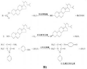 血清中的胆固醇酯被胆固醇酯酶水解成游离胆固醇,后者被胆固醇氧化酶氧化为△4-胆甾烯酮并产生过氧化化氢。再经过氧化物酶催化反应指示剂显色(通常用Trinder反应),反应式如下(图1):醌亚胺在480~550nm波长有最大吸收,所产生颜色强度与血清总胆固醇量成正比,再通过与同样处理的标准血清比较,经计算即可求出血清总胆固醇与胆固醇脂的比值。