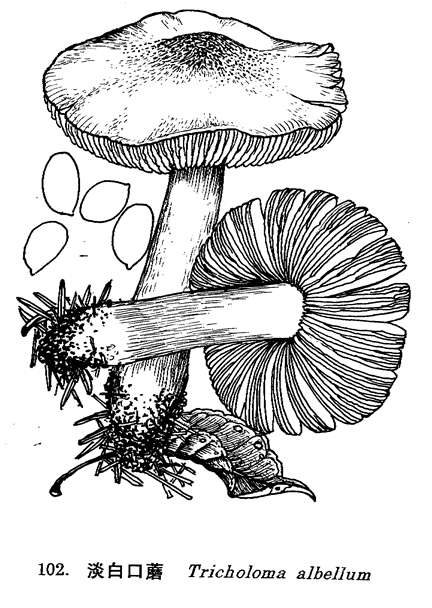 子实体中等大。菌盖直径4-11.5cm,半球形至扁半球形,白色至白微带黄色,被白色的粉末状绒毛至近光滑,表面层易与菌肉分开,边缘整齐,稍内卷。菌肉纯白色,具香味,近菌柄处厚8-20mm。菌褶弯生,乳白色,老熟时乳黄色,不等长,很密,菌柄中生,圆柱形,10-17cm×0.9-2.5cm,向下渐粗,基部近球状,粗可达5.3cm,具纤毛和条纹。孢子印白色。孢子无色,光滑,近球形或椭圆形,5-6μm×3.6-4μm,含一油球。图例
