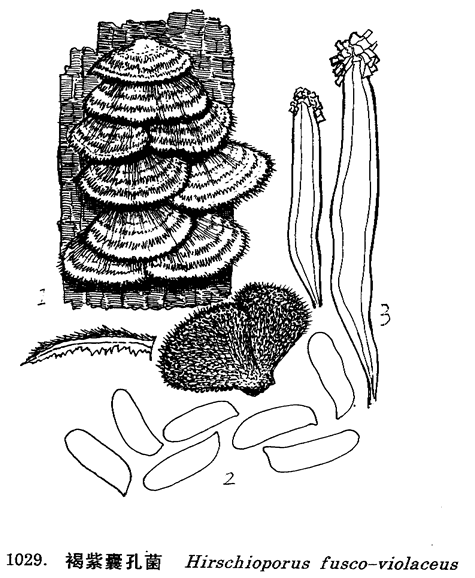 图 1029 褐紫囊孔菌 : 1. 子实体, 2. 孢子, 3. 囊体