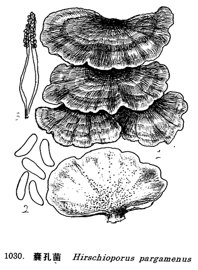图 1030 囊孔菌 : 1. 子实体, 2. 孢子, 3. 囊体