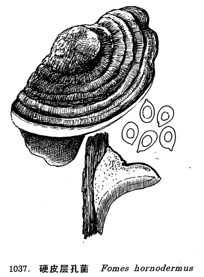 图 1037 硬皮层孔菌 : 1. 子实体, 2. 孢子