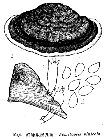 图 1044 红缘拟层孔菌 : 1. 子实体, 2. 孢子, 3. 担子