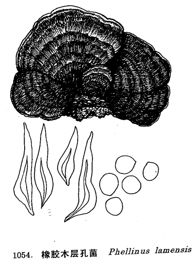 子实体中等至较大。菌盖无柄或平伏而反卷,半圆形,近覆瓦状,扁平,复有角质而脆的皮壳,其上有同心棱纹,具细绒毛或无毛,锈竭色至暗灰色,2-6.5(16)cm×4-8.5(20)cm,厚6-12(30)mm。边缘厚、钝,完整或稍呈波浪状,下侧无子实层,菌肉锈褐色至浅咖啡色,厚3-4mm。菌管色较菌肉为深,管口咖啡色,酱色至深棕灰色,圆形,平均每毫米6个。刚毛多,15-35μm×5-8μm;孢子无色,球形,直径4-4.5μm。图例