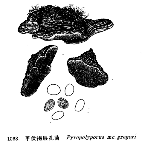 子实体比较小,半平伏,反卷部分1-1.5 cm×2.5-5cm,菌盖表面暗灰色,有狭密环状棱纹,边缘深咖啡色并有微细绒毛。菌肉薄,深咖啡色。菌管多层,每层厚1-1.5mm。管口咖啡色,近圆形,每毫米4-5个。孢子宽椭圆形光滑,有色,5-6μm×4-4.5μm。菌丝有色、薄壁,无横隔,直径2.5-3.5μm。