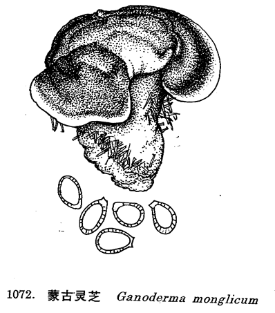 子实体小或中等。菌盖直径5-10cm,圆形或肾形,壳状,不发光,污赭色、褐色或暗色,无环纹或有不明显的环纹,边缘同色,表面有皱纹或小疣,缢缩状,紫黑色。菌肉厚1-2cm,木色,软木质,易破碎,土铜色或污褐色,干时常网状开裂。孔口同色,直径0.15-0.3mm,圆形或近有棱角。菌丝粗1-6μm,壁厚。菌柄侧生,长5-8cm,粗2-3cm,壳状或涂漆状,紫黑色。孢子褐色,倒卵形,基部平截或圆锥状,无色,有小刺,9-12μm×6.5-8μm。图例