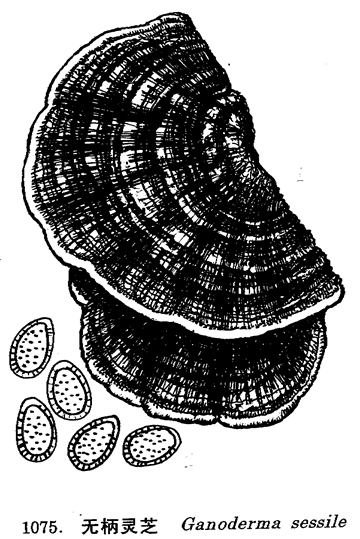 子实体大,无柄,木栓质。菌盖半圆形或近扇形,10-38cm×15-27cm,基部厚7-9cm,黑褐到红褐色,靠外边土红褐色至土黄褐色,幼时边缘浅土黄色,环带宽,表面漆样光泽。菌肉木材色,接近菌管处褐色至内桂色,厚0.5-0.8cm,有环生。菌丝无锁状联合。菌管长0.5-0.8cm,初期淡色,后呈淡褐色至褐色 。管口近圆形,色较浅,每毫米4-5个。孢子卵圆形,顶端平截,双层壁,外壁无色,内壁有小刺,淡褐色,或有油滴,7.8-10.4μm×5.2-6.9μm。图例