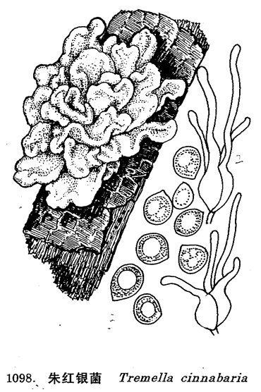 图 1098 朱红银菌 : 1.子实体, 2.担子, 3.孢子。
