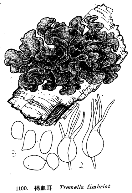 图 1100 褐血耳 : 1.子实体, 2.担子, 3.孢子。