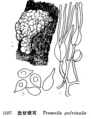 子实体小,胶质,纯白色,半透明,垫状扩展,长1-3cm,稀达10cm ,宽0.5-3cm,高0.2-1.5cm,表面具脑状沟回,干后强烈收缩。菌丝宽2.5-4.5μm,锁状联合多,显著。子实层无分生孢子。下担子卵形至卵状椭圆形,长11-17.5μm ,宽10-14μm ,2-4纵裂,上担子37.5-88μm×2.5-3μm,孢子卵形,有小尖,7-10μm×5-7μm,内含一个油球。图例