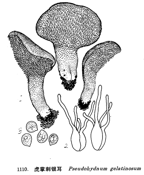 子实体较小,半透明似胶质,软、污白色扇形,匙形或掌状至圆形,具短柄。菌盖直径2-6cm,阴湿处多呈污白至乳白色,光多处带淡褐色,开始有细毛,后变光滑。菌盖下密生长约0.2-0.5cm的小肉剌。菌柄长约1cm,粗0.5-0.8cm。孢子近球形,无色,遇KOH带黄色,7.4-8.4μm×4.6-6.4μm。担子具4小梗。图例