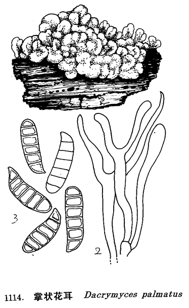 图 1114 掌状花耳 : 1.子实体, 2.担子, 3.孢子。