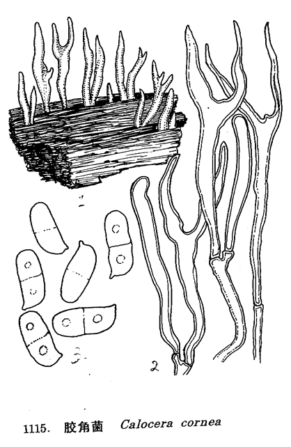 图 1115 胶角菌 : 1.子实体, 2.担子, 3.孢子。