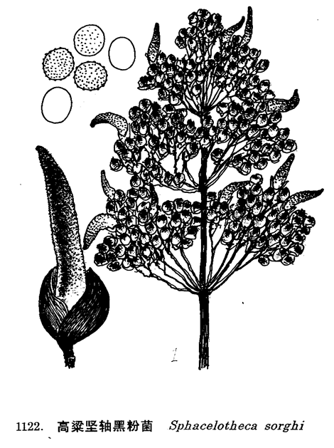 图 1122 高粱坚轴黑粉菌 : 1. 孢子堆生长在高粱穗上, 2. 放大的孢子堆, 3. 孢子