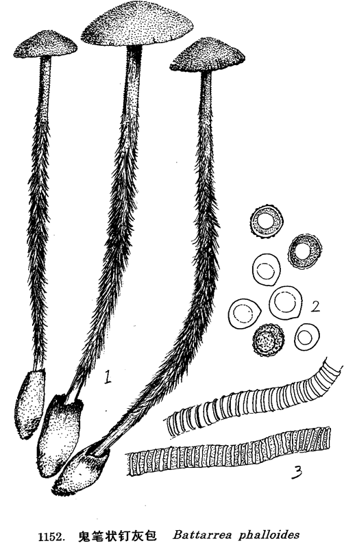 图 1152 鬼笔状钉灰包 : 1. 子实体, 2. 孢子, 3. 孢丝