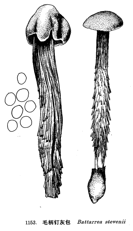 图 1153 毛柄钉灰包 : 1. 子实体, 2. 孢子