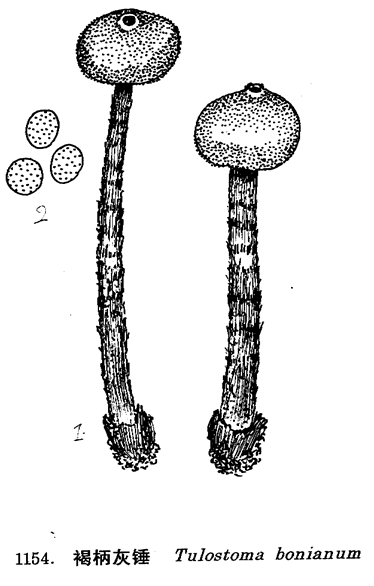图 1154 褐柄灰锤 : 1. 子实体, 2. 孢子