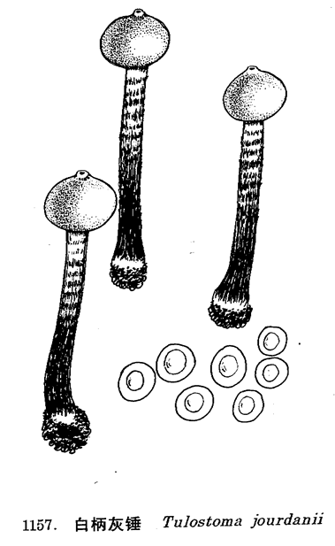 子实体小。包被扁球形,灰白色,膜质,宽1-1.7cm,高0.7-1.3cm,具外凸、圆形的顶孔,直径0.15-0.2cm,菌柄圆柱形,中空,长2-4cm,粗0.3-0.6cm,表面撕裂成鳞片并有纵条纹,上部白色,向下部渐呈红色,内部白色,顶部插入包被基部的凹穴内。孢体深肉桂色,松软呈粉末状。孢子近球形,有色,孢壁粗糙,直径4.5-6μm。孢丝透明,粗3.5-8μm。有分枝,横隔少,隔膜处膨大有色。图例