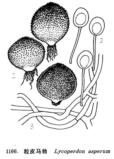 图 1166 粒皮马勃 : 1. 子实体, 2. 孢子, 3. 孢丝