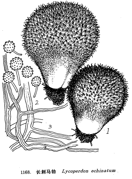 图 1168 长剌马勃 : 1. 子实体, 2. 孢子, 3. 孢丝