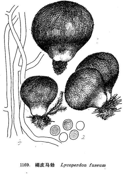 图 1169 褐皮马勃 : 1. 子实体, 2. 孢子, 3. 孢丝